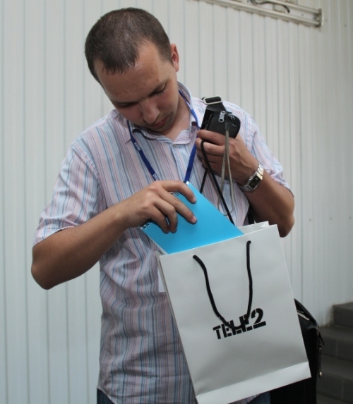 улыбающиеся девушки, вручившие всем пакеты Tele2 с пресс-папкой и сувенирами.