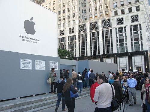 Магазин Apple Store. Как я и ожидал, жители и гости города несут цветы, зажигают свечки и кладут яблоки. Очень символичное зрелище. Почему-то слово «печальное» не подходит к той атмосфере, которой окружен магазин Apple. В воздухе скорбь и восхищение.