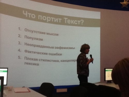 19 ноября в информцентре прошел мастер-класс Любови Стрельниковой для студентов отделения журналистики филологического факультета Смоленского государственного университета. Начинающие журналисты попробовали свои силы в предложенных базовых тренингах, задумались о значении научно-популярных публикаций, оценили роль взаимосвязи разностороннего образования и востребованной журналистики. «Весь мир пронизан причинно-следственными связями. Вы должны впитывать эти связи. Вам необходимы ассоциации, чтобы сделать текст содержательным», — говорила Любовь Стрельникова юным журналистам, работая вместе с ними над ассоциативным рядом. Итогом мастер-класса стала работа над текстом. «Больше всего, что портит текст — это отсутствие мысли. Чтобы хорошо научиться писать, надо много читать», — убеждена Любовь Стрельникова.