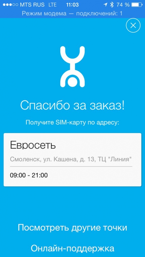 Теоретически, подключиться к Yota очень просто. Заходим на сайт, выбираем, откуда хотим забрать сим-карту (ну или вызываем к себе бесплатного курьера домой или на работу) и получаем её. К сожалению, практика оказалась немного в стороне от теории, и не по вине Yota. 1-го сентября, узнав о запуске Yota, я пошёл в ближайшие к дому салоны сотовой связи, чтобы приобрести необходимый кусок пластика. И если в «Связном» мне сказали, что сим-карты уже разобрали (в первый день продаж, к 16 часам дня – отличный результат!), то в «Евросети» девочка-консультант дважды сквозь зубы на мой вопрос о сим-картах процедила: