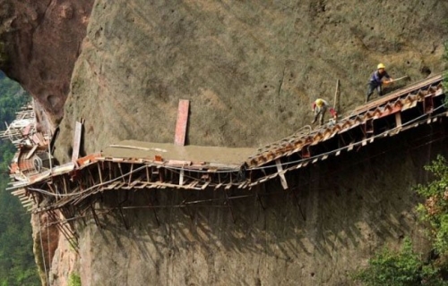 Проблема перенаселения в Китае достигла своего максимума. В КНР проживает более 1,3 миллиарда человек. Население ежегодно увеличивается. В связи с этим приходится как-то решать благоустройство жителей. И вот в Китае начали освоение необжитых территорий. Есть несколько фотографий, как китайцы строят тропинку на скалу, где будут размещены дома. Работа в таких условиях не только требует сконцентрированности и внимательности, но и смелости.