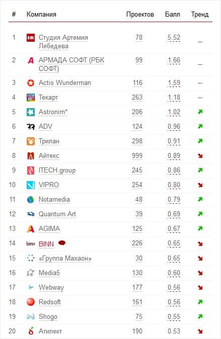 Первая пятёрка лидеров рейтинга по сравнению с прошлым годом почти не изменилась. Первое место по-преженему остаётся за Студией Лебедева, следом за ней расположились АРМАДА СОФТ (бывший «РБК СОФТ»), Actis Wunderman и Текарт. Пятое место в этом году заняла студия Astronim*, в прошлогоднем рейтинге стоявшая на шестой позиции. А «пятёрка» прошлого года — студия Айтекс — опустилась на три позиции вниз, покинув ТОП-5, но всё же сумела удержаться в ТОП-10.