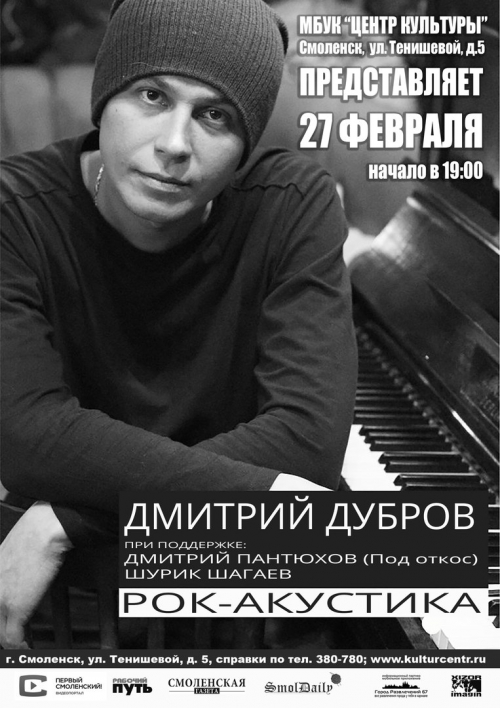 27 февраля в 19.00 в Центре Культуры для вас выступят: смоляне Шурик Шагаев и Дмитрий Пантюхов, а также специальный гость из Украины Дмитрий Дубров. Вход свободный.
