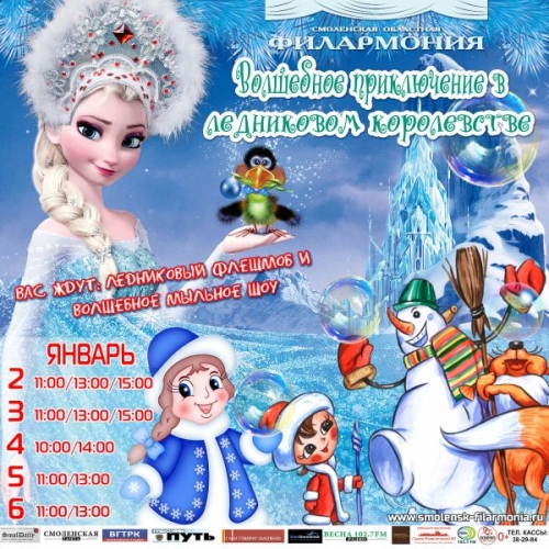В зале Смоленской областной филармонии пройдут детские праздники «Волшебное приключение в Ледниковом королевстве» (0+) со сказочными персонажами. Вас ждут ледниковый флешмоб и волшебное мыльное шоу. Расписание утренников: