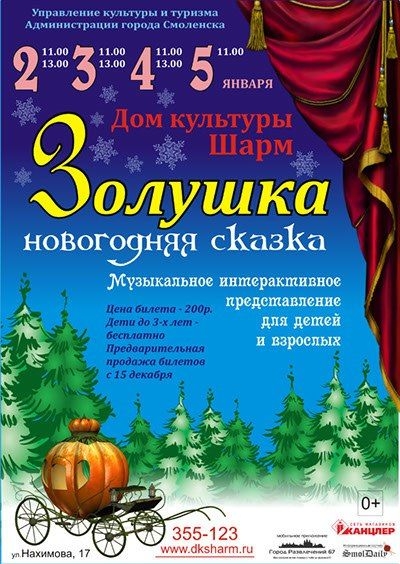 На сцене ДК «ШАРМ» пройдут показы новогоднего интерактивного спектакля для детей и их родителей «Золушка» (0+). 2—4 января представление пройдет в 11:00 и 13:00, 5 января в 11:00.