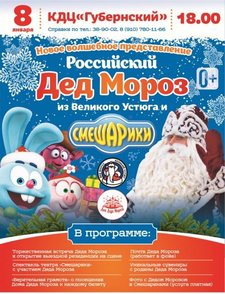 8 января в 18:00 в КДЦ «Губернский» пройдет волшебное представление Главного Деда Мороза из Великого Устюга и его друзей Смешариков (0+) Из представления, насыщенного музыкой, песнями и всевозможными приключениями маленькие зрители узнают о настоящей дружбе и окунутся в водоворот приключений вместе со своими любимыми героями. Каждому зрителю будет вручена «Верительная грамота» о том, что он побывал в выездном «Доме Деда Мороза».