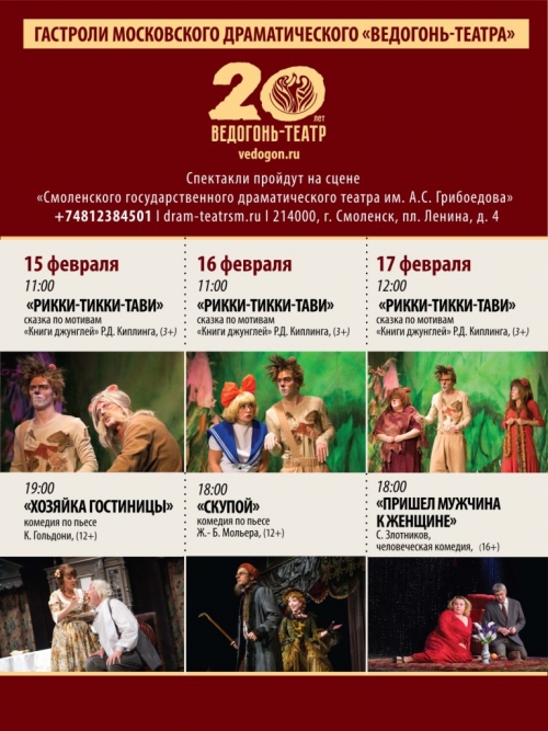 С 15 по 17 февраля в Смоленске пройдут гастроли московского драматического «Ведогонь-театра». Гости представят детскую сказку по мотивам «Книги Джунглей», две классические комедии по произведениям Ж.Б.Мольера и К.Гольдони, а также человеческую историю об одиночестве и взаимоотношениях двух взрослых людей.