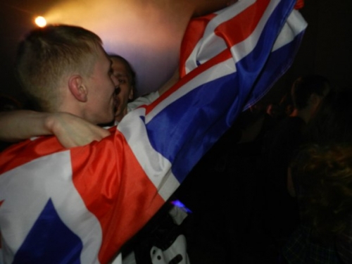Из зала «брызгали» вспышки камер и раздавались радостные крики публики. Передние ряды усердно салютовали кулаками и козами. Чуть поодаль, в слемящейся толпе, мелькали оголенные торсы, эрокезы, улыбающиеся лица и британский флаг.
