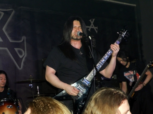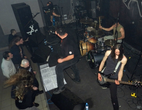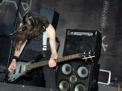 Следом не замедлили показаться Desecravity. Все как один с длинными волосами и серьезными лицами, отражавшими полную отрешенность и глубину момента. На проверку инструментов ушло не больше минуты. Затем, как по команде, музыканты заняли на сцене строго отведенные места, прозвучало нагнетающее интро. Воздетые к небу (точнее – потолку) руки резко переместились на гитары, барабаны мигом отозвались угрощающим ритмом. Сразу возникла мысль, что по сравнению с ними первая команда звучала достаточно невинно и легко.