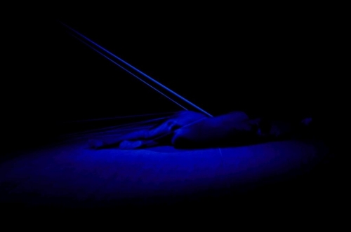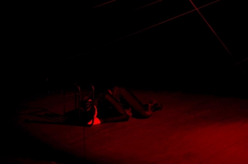 Сценография спектакля также предельно лаконична: в ней нет пестрых цветов, пышных нарядов, вызывающей яркости. Черная кулиса, серый пол, стул без сидения и спинки, кусок ткани и более двадцати пересекающихся эластичных веревок. Зал и сцена погружены в темноту.