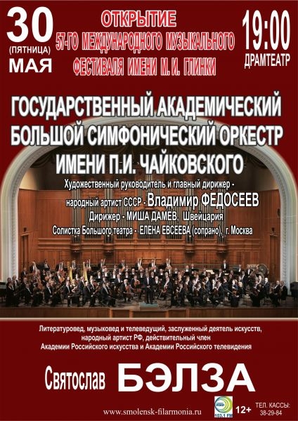 Открытие 57-го Международного музыкального фестиваля им. М.И. Глинки состоится 30 мая в Драмтеатре в 19:00. На сцене выступит Большой симфонический оркестр им. П.И.Чайковского (дирижер – народный артист СССР – Владимир Федосеев). Концертную программу будет вести литературовед, музыковед и телеведущий – Святослав Бэлза.