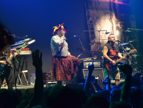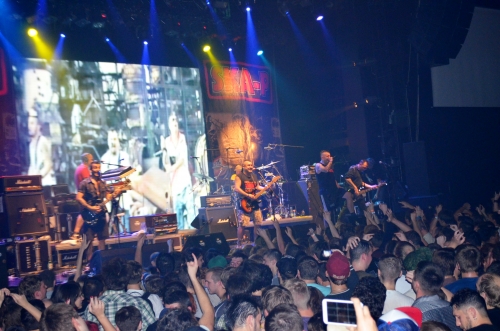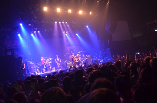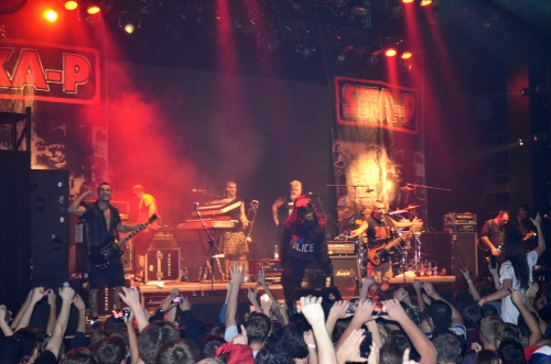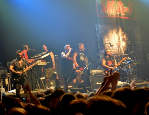 Когда удалось попасть внутрь, разогревающая группа благополучно заканчивала играть последнюю песню и на этой веселой ноте прощалась с залом, передавая сцену в руки отстраивающего персонала SKA-P. А это немного не мало 8 человек, постоянно сопровождающих группу в туре – каждый ответственен за «свой» инструмент и его звучание.