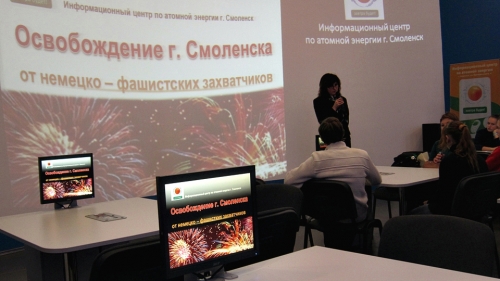 Сначала ребята на большом видеоэкране посмотрели кинохронику, рассказывающую о том, при каких обстоятельствах была оккупирована территория Смоленщины, как формировались партизанские отряды и как, ценой невероятных усилий и тысяч жертв, был освобожден Смоленск и вся территория Смоленщины. Затем школьникам представилась возможность проверить свои знания об истории родного края в период Великой Отечественной войны при помощи интерактивной викторины. Ответы школьников показали, что не все ребята обладают хорошими знаниями. Но победители все равно определились, и они получили сувениры от информационного центра.