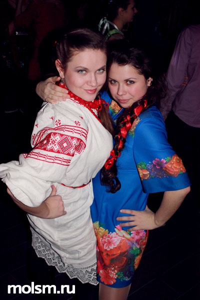 СмолГУ, а именно — учащиеся филфака и иняза. Вечеринка была стилизованной: правильный дресс-код в эту ночь — костюмы селян. Девушки оказались самыми сообразительными: кто-то нашел старую белую рубашку с ручной вышивкой, кто-то надел платье в цветочек, которое было модно года три-четыре назад, некоторые просто вплели красные ленты в волосы. Ребята же надели обычную одежду, но это не помешало им влиться в общую атмосферу праздника.