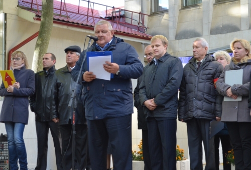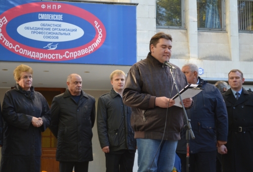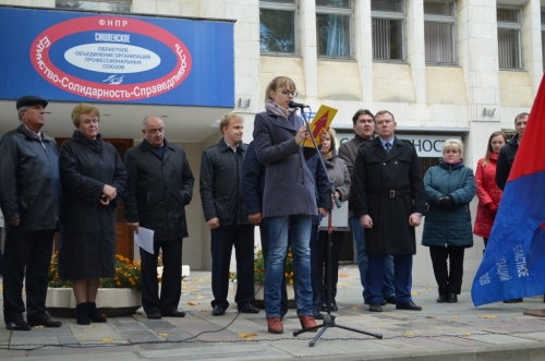 Открыл и вел митинг Председатель Смоленского профобъединения Е. И. Максименко. В своем выступлении он отметил, что в условиях роста инфляции, которая превысила все прогнозные значения, произошли ощутимые изменения уровня и качества жизни населения страны. Доля работников с заработной платой ниже прожиточного минимума для трудоспособного населения в 2015 году составила почти 12,5%. На сегодняшний день государству необходимо обратить внимание на развитие промышленности, транспорта и связи, где создаются материальные блага нашей страны. Профсюзы всегда выступали за то, чтобы в период экономического спада государство проводило активную политику стимулирования внутреннего спроса, в том числе за счет увеличения покупательской способности граждан. Но вместо этого главным инструментом финансовой политики страны стал проект госбюджета на 2016 год, который ущемляет права трудящихся и пенсионеров на 2016 год.