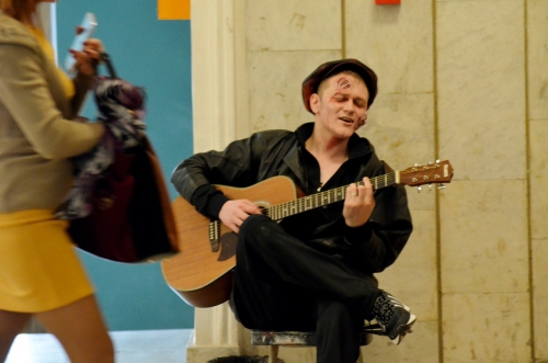 Перед началом комедии зрителей смоленской драмы встречали обаятельные герои спектакля: один играл на гитаре, другой «завис» в гардеробе, третьи раздавали программки и просто веселили публику.