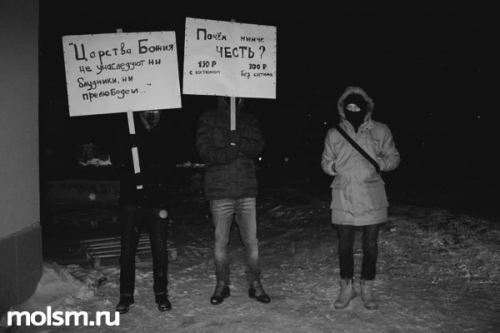 а на счёт людей с плокатами....у одного из них написано "Царство Божия не унаследуют ни блудники, ни прелюбодеи" так зачем поливать матом и оскарблениями тех, кто заходил в клуб, если уж зарекнулись о Боге... Ребята с плакатами, вам походу тоже тогда этого не унаследовать, сквернословие - один из смертных грехов...