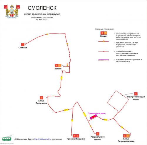 Количество действующих маршрутов в г. Смоленске – 5 (№1, №2, №3, №4 и №7). Система линейная, кольцевых маршрутов не имеет. Единственный маршрут кольцевой был №14, но это было так давно – в 1993 году! После снятия линии по ул. Б. Советская, система стала линейной! Маршруты: