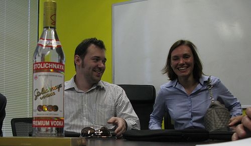 Офис компании представляет один большой open space. У каждого сотрудника свое небольшое место и огромный mac-монитор. Людей очень много, все активно работают и даже не обращают внимание на наше появление. Такой творческий муравейник. Все оформлено стильно, креативно. На рецепшене нас встретили табличкой «Добро пожаловать» (на русском языке), а в конференц-зале предложили выпить водки. В общем подготовились к нашему приходу)