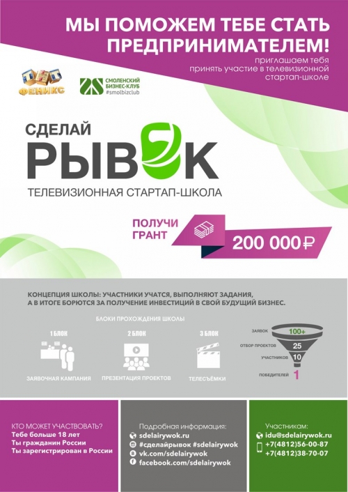 «Смоленский бизнес-клуб» и «ТНТ-Феникс Смоленск» предлагают смолянам пройти обучение в стартап-школе «Рывок» и получить грант 200 тысяч рублей на развитие своего дела. Весь путь участников проекта будет показан на телеэкране! Обучение в школе — бесплатное.