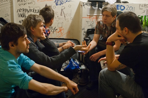 Molsm: Ребят, как доехали? Я знаю, в Брянске с вами чудеса творились. Антон «Бу» Лисов: В Брянске, да… Вообще концерт отличный был. Мы поездили по Украине и вернулись наконец-то домой. Первый концерт в России как раз случился в Брянске, и он вышел отличный. Только ночью не удалось поспать. Мы бегали с мокрыми полотенцами, пытались вынести шмотки. Спасались от пожара, спасали сегодняшний концерт. (улыбается)