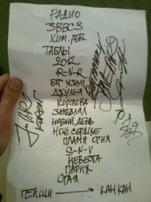 П.С. Бонусом прилагаю примерный трек-лист концерта и видео с концерта. От себя добавлю, что в программе были замечены песни «Сестра милосердия» и «Рубиновые обрезы».