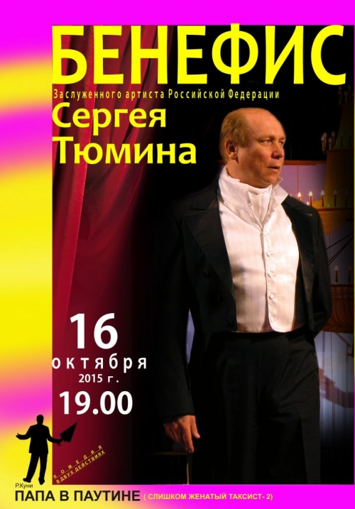 16 октября на большой сцене Смоленского государственного драматического театра имени А.С. Грибоедова пройдет бенефис Заслуженного артиста РФ Сергея Тюмина. В этот вечер вы увидите комедию в двух действиях «Папа в паутине» — продолжение известной истории о «Слишком женатом таксисте» — с участием Сергея Борисовича.
