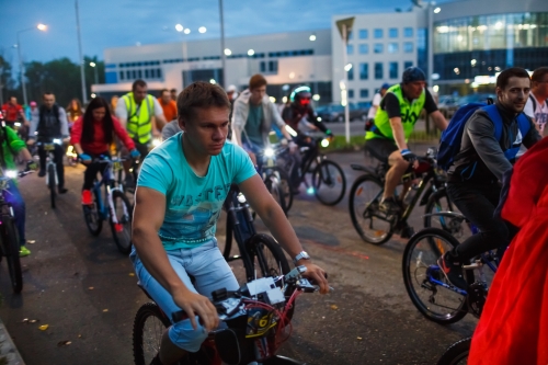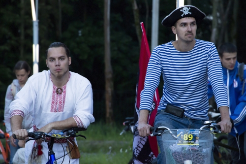 А потом на олимп, кажется, дозвонились, и велосипедисты, кто в пышной голубой юбке, кто обмотанный светодиодами, кто в костюме, возвращающем к самым памятным школьным утренникам, потянулись по мокрому асфальту к месту встречи.