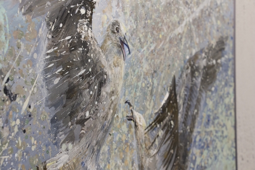 А потом тишину внезапно взрывают крики прибрежных чаек, питающихся рыбой. Они кричат не так, как их серые городские собратья, охотящиеся, в основном, на мусор. Хотя все равно, каждое утро, разбуженная их надрывным клекотом, верю в то, что за шторами в ленивой дреме ждет приморский городок… Такие воспоминания во мне пробудила серия картин «Птицы». Теперь это уже не тишина – это движение в каждом мазке, это готовность сорваться в любую секунду, это сильный ветер меж перьев и громкий крик.