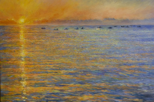 А потом прерывистые крики чаек сменяют тягучие песни пляжных зазывал, яркие кепки и зонтики, цветные купальники, запах пахлавы и инжира, кисловатый привкус оливок, сиреневый цвет крымской горной лаванды. И однообразие картин какого-то другого мариниста тихо синеет на какой-нибудь другой выставке, пока на этой – такой искристый калейдоскоп красок и эмоций, настоящий праздник жизни.