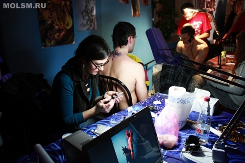 За творчеством мастеров, как обычно, можно было наблюдать «в прямом эфире»: каждый татуировщик прибыл на конвенцию со своей моделью. Правда, увидеть процесс появления тату «с нуля» не получилось, мастера на глазах у любопытствующих заканчивали уже начатые работы. Масштабы и сложность некоторых поражали, как и разнообразие стилей и жанров.
