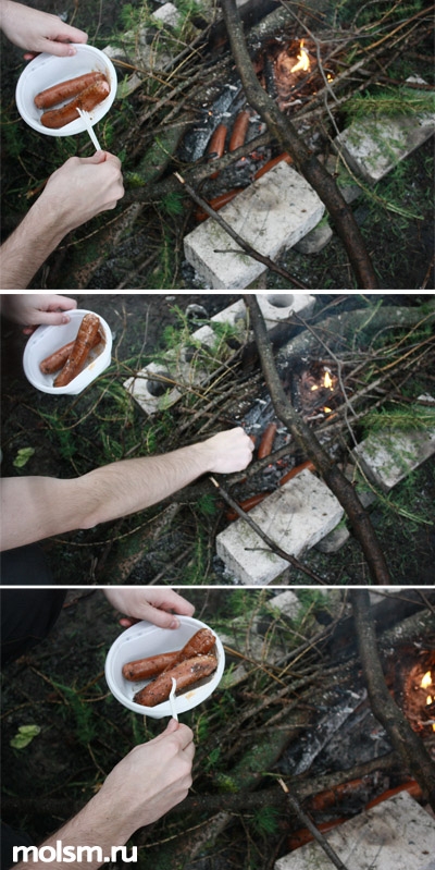 Огонь горел, музыка еще играла, а, значит, отдых продолжался, и все было хорошо. Подошла очередная партия сосисок, которые кто-то принес с собой. Их, прожаренных на костре, водрузили на деревянный стол и предложили отведать. Получилось действительно вкусно и недорого.