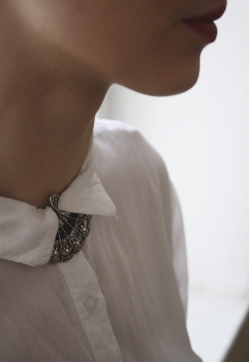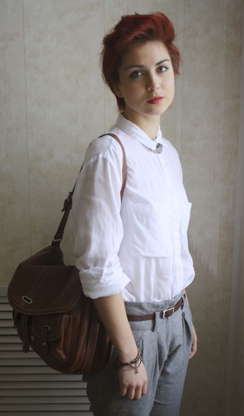 На мне сейчас удобная широкая рубашка. Очень люблю такой фасон. Брошь, случайно купленная в каталоге косметики известной фирмы. Теплые штаны с высокой посадкой (хорошо, что мода на заниженную талию позади) и ремень, честно украденный на барахолке в Питере.