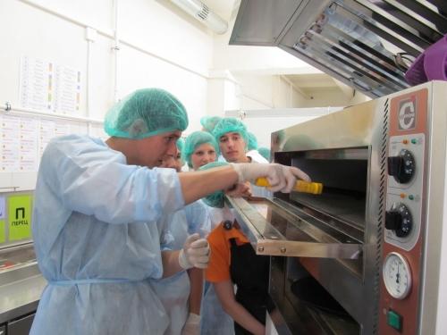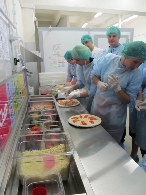 Наконец настал долгожданный момент, и гости получили возможность опробовать свои силы в приготовлении любимого «Додо» — лакомства. Тесто мы не месили — нам его принесли готовым из холодильника. Как объяснили опытные пицца-мэйкеры, чем старше тесто, тем вкуснее получается изделие. Справиться с основой для такого блюда новичку очень непросто — это целая наука. Поэтому нам на помощь пришел Владимир — сразу стало видно, что молодой человек неоднократно практиковался в этом нелегком деле, причем, весьма успешно. Когда же тесто попало в руки дилетанта и было подпорчено, оно без лишних слов отправилось в мусорный бак. И это неудивительно: процесс настолько замысловатый, что претендентам на звание пицца-мэйкера приходится даже сдавать специальные нормативы. Оправившись от потери, мы тут же приступили к очередной заготовке: на этот раз все получилось. Работа на кухне постепенно закипала. Каждый нашел занятие по вкусу: кто-то работал с основами для будущих пицц, кто-то — с начинками, кто-то следил за тем, как они пекутся, а кто-то разрезал «горячих красавиц».