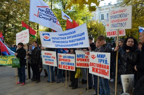 Открыл и вел митинг Председатель Смоленского областного объединения организаций профсоюзов Е.И. Максименко. Перед собравшимися – студентами, членами обкомов и первичек, профсоюзными активистами – выступили заместитель губернатора Смоленской области О.В. Окунева, а также представители отраслевых профсоюзов.