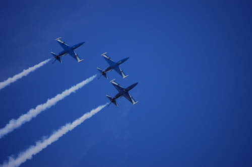 Особое внимание зрителей заслужила пилотажная группа «Русь» из Вязьмы. Четыре самолета Л-39 рисовали на небе фигуры. Все стояли с открытыми ртами и поднимали руки вверх, хлопая и приветствуя пилотов, когда те исполняли очередной трюк. Апогеем выступления стала фигура под названием «сердце», которую пилоты исполнили специально для прекрасных дам. Два самолета рисовали сердце, а третий протыкал его стрелой. Зрители были в восторге!